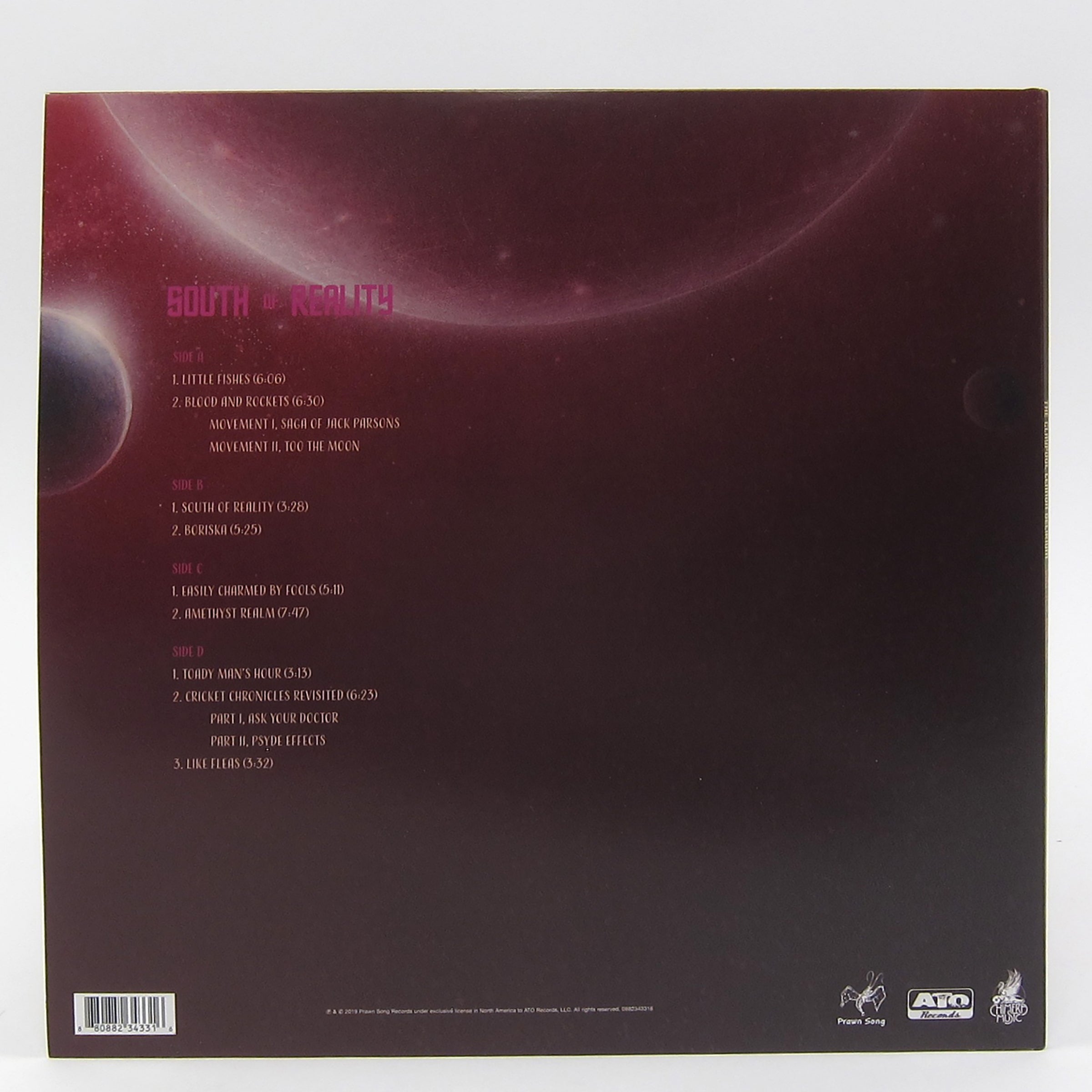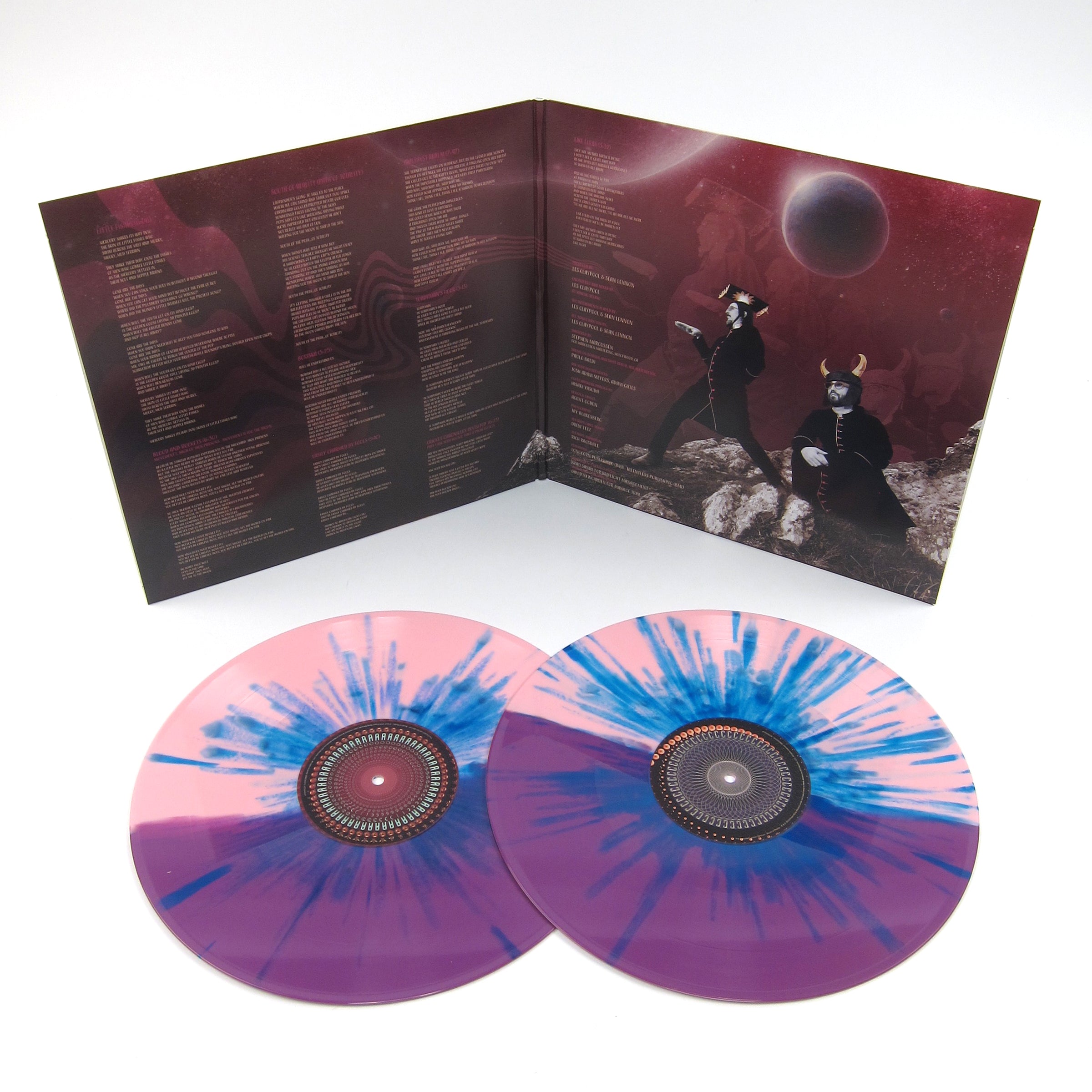 A little more than two years after their debut delirium, "Monolith Of Phobos," the freaky-deaky duo consisting of Primus' Les Claypool and Sean Lennon - aka The Claypool Lennon Delirium - are back with their epically out-there sophomore release, South Of Reality. Produced by the duo and mixed / engineered by Les Claypool at his own studio in California, the album blends the wildly surreal with a psychedelic sound and biting satirical social commentary. It's an almost organic extension of their debut, with progressive rock colliding with blissed-out refrains and weird, spacey sun-dazed harmonies. The duo complement each other just like John and Paul did, and while there are obvious echoes to the production tricks of The Beatles, these echoes act as points of bizarre departure into the musical abyss. Check out the tracks "Blood and Rockets: Movement I," "Too the Moon," "Toadyman's Hour" and "Little Fishes" for a deliciously trippy taste into the bizarre. With the added zoetrope label design by Drew Tetz, the presentation of the album is just as killer! 9 tracks in all, pressed onto two pink + purple split color vinyl with blue splatter and housed in a gatefold sleeve. Released by ATO Records