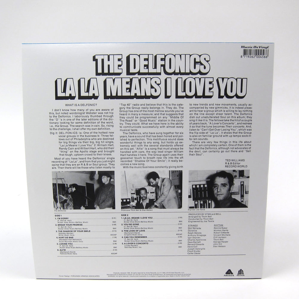 Heavyweight pressing of The Delfonics' classic debut full length. Originally released in 1968, La La Means I Love You introduced the world to the lush and smooth sound of the Philly soul trio. Lead singer and founding member William "Poogie" Hart handled much of the song writing and composition here, with the legendary production team of Stan & Bell (aka Thom Bell and Stan Watson) on arrangement and instrumentation. The result was one of the earliest and most influential harbingers of the Philly Soul Sound, and gave us not only the infectious title track (as sampled by Ghostface, Nicki Minaj and many others), but also chart toppers "I'm Sorry," "Break Your Promise," and many others. This 2018 Music On Vinyl pressing comes on audiophile 180 gram vinyl for the superior listening experience.