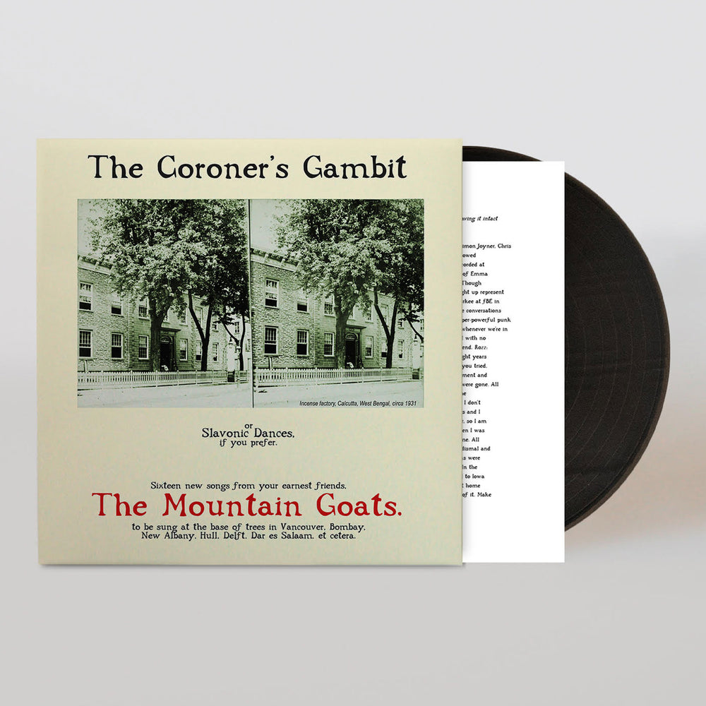"There are few records in the Mountain Goats catalog that are closer to my heart than The Coroner's Gambit. It bears a sonic thumbprint shared by none of its brethren (Panasonic RX-FT500, Marantz PMD-222, and sessions in Omaha probably recorded to a Tascam Porta-One) and while two of those sources appear on several later releases, none of the other records really sound like it. Although it contains exactly no autobiographical songs, it feels personal to me — intimate, diaristic. I have vivid memories of the songs I wrote and recorded in Colo, and foggy memories of the Greyhound trip to and from Omaha. I was taking Greyhounds across Midwestern state lines to record songs with friends when I made The Coroner's Gambit, is what I'm saying. You can maybe hear the exhaust of the Greyhound in the songs if you listen close." - John Darnielle- black vinyl pressing (please note: actual pressing color and packaging may differ from mock-up photo)