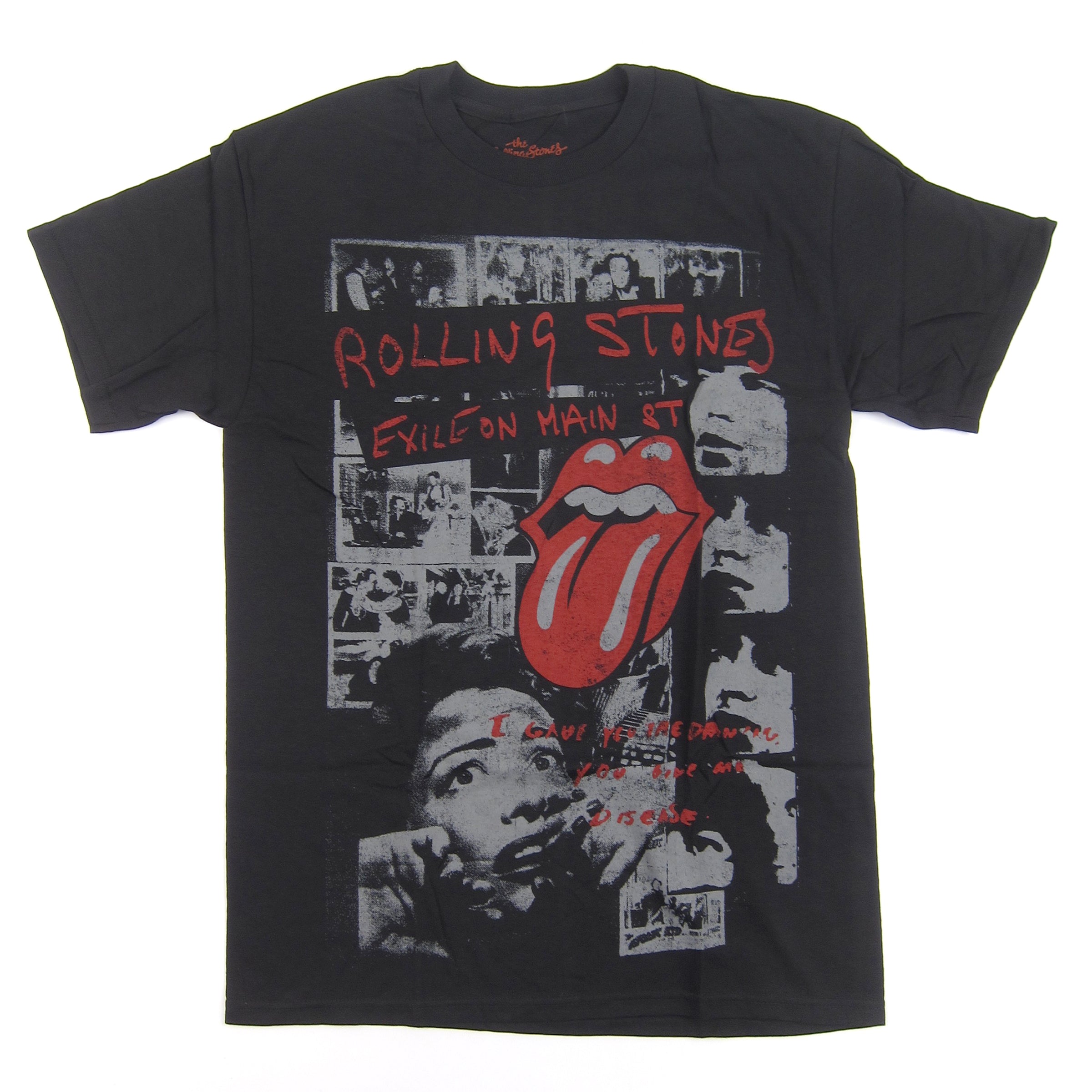You got to roll me. Artwork from The Rolling Stones' 1972 album Exile on Main Street gets printed up as an official tee. Features the iconic Jagger mouth logo, along with elements from the gatefold artwork, printed on all cotton, standard fit shirts.