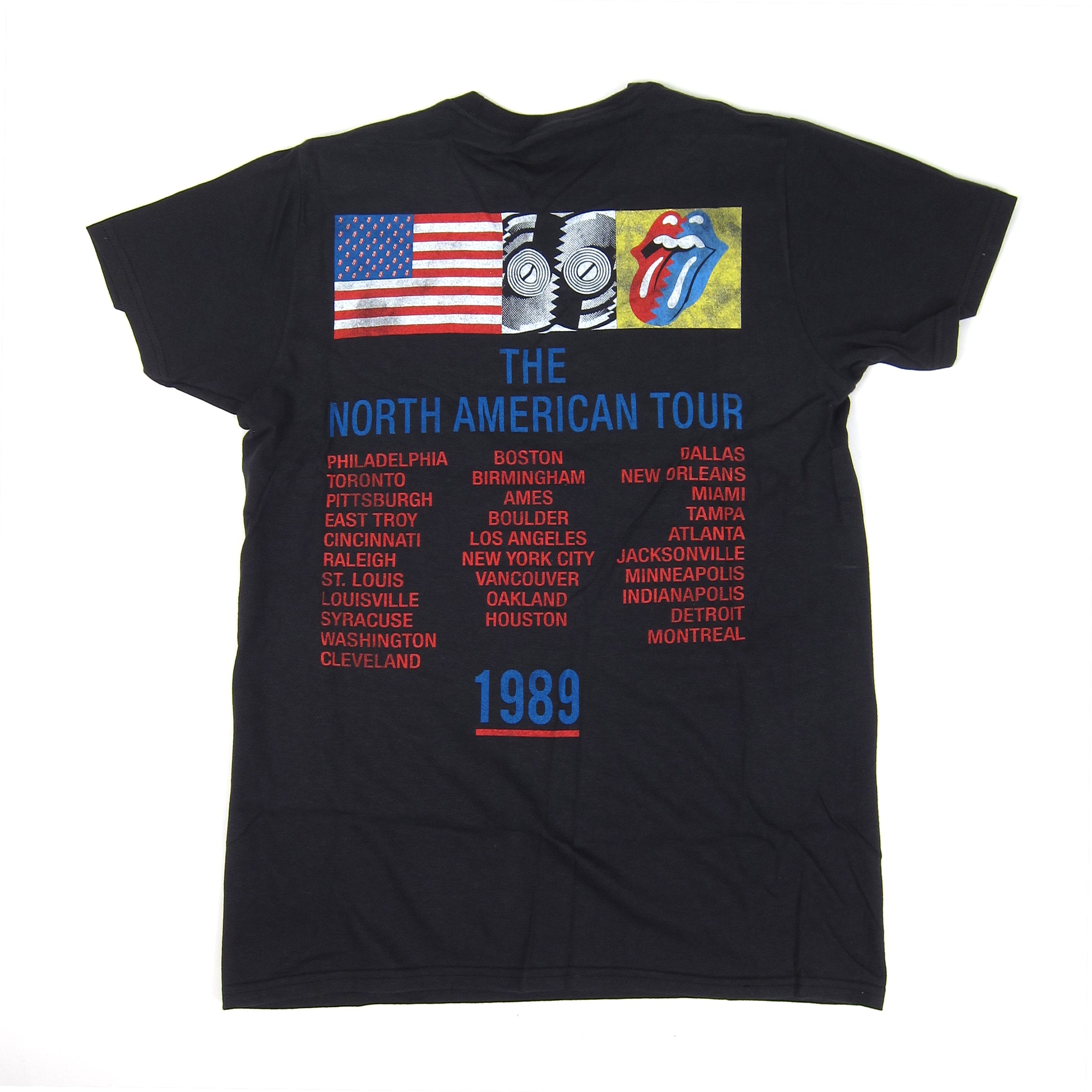 Party like it's 1989 with this official Rolling Stones reproduction tour shirt. Features distressed front and back print listing tour cities. All cotton.