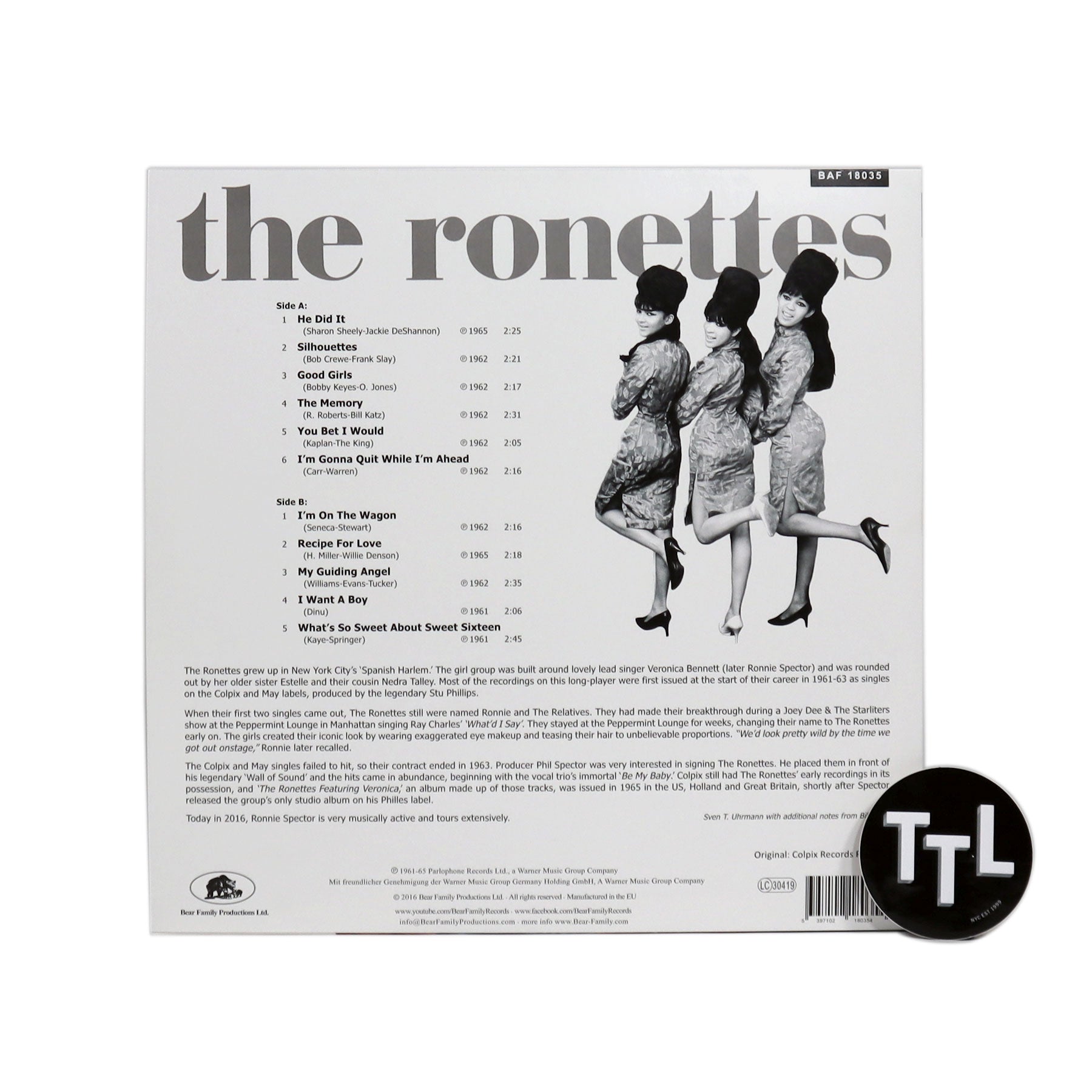 "The Ronettes grew up in New York City’s ‘Spanish Harlem.’ The girl group was built around lovely lead singer Veronica Bennett (later Ronnie Spector who passed away in January, 2022) and was rounded out by her older sister Estelle and their cousin Nedra Talley. Most of the recordings on this long-player were first issued at the start of their career in 1961-63 as singles on the Colpix and May labels, produced by the legendary Stu Phillips. When their first two singles came out, The Ronettes still were named Ronnie and The Relatives. They had made their breakthrough during a Joey Dee & The Starliters show at the Peppermint Lounge in Manhattan singing Ray Charles’ What’d I Say. They stayed at the Peppermint Lounge for weeks, changing their name to The Ronettes early on. The girls created their iconic look by wearing exaggerated eye makeup and teasing their hair to unbelievable proportions. 'We'd look pretty wild by the time we got out onstage,' Ronnie later recalled. The Colpix and May singles failed to hit, so their contract ended in 1963. Producer Phil Spector was very interested in signing The Ronettes. He placed them in front of his legendary ‘Wall of Sound’ and the hits came in abundance, beginning with the vocal trio’s immortal Be My Baby. Colpix still had The Ronettes’ early recordings in its possession, and ‘The Ronettes Featuring Veronica,’ an album made up of those tracks, was issued in 1965 in the US, Holland and Great Britain, shortly after Spector released the group’s only studio album on his Philles label." - Bear Family