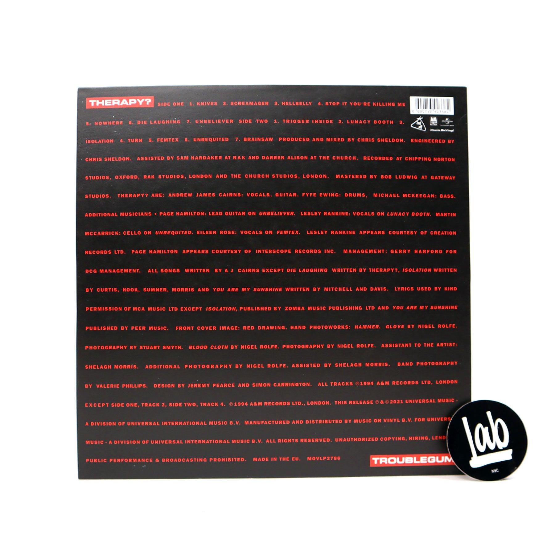 "Therapy? are an alternative metal band from Northern Ireland. The band was formed in 1989 by guitarist-vocalist Andy Cairns and drummer-vocalist Fyfe Ewing. To complete the lineup, the band recruited bassist Michael McKeegan. 1994 saw the release of the commercially successful Troublegum album which earned the band appearances at a string of rock and indie festivals, including Reading, Donington and Phoenix in the UK alone, as well as a clutch of top 40 singles. It achieved a string of nominations in end-of-year polls, including a Mercury Music Prize nomination, and success at the Kerrang! Awards. The album has a melodically dark, metal-like sound. Troublegum is generally considered to be Therapy? at their musical and commercial peak and has since sold over one million copies worldwide. Includes the singles 'Screamager', 'Turn”, “Nowhere', 'Trigger Inside', 'Die Laughing' and 'Isolation' (Joy Division cover)." - Music On Vinyl
