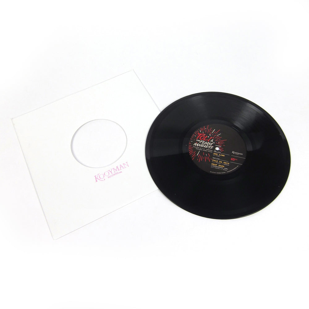 Abandoned debut recordings by Brooklyn afrobeat crew, unearthed and remastered! The Femm Nameless were an all-female afrobeat outfit led by Anitbalas-affiliated trombonist Toli Nameless. The 8-piece band played a number of shows in and around Brooklyn and quickly amassed a huge local following via word of mouth. They hunkered down to record a demo in 2003, but disbanded before they could properly shop it and the recordings were shelved. Kooyman Records (they put out that 7” of brassy Kendrick & Major Lazer covers that floored us a couple years back) dug them out and remastered them for this heavy 10-inch vinyl pressing, and the results are stunning. Toli’s razor-sharp flow easily recalls Fela Kuti but with a unique feminine energy, and the rest of the band confidently walk that line between free improvisation and staying deep in the pocket. On the a-side, a deep afrobeat version of Nina Simone’s “See Line,” backed with an original called “Talk Da Shit.” The record winds down with “Deaf Ears (Instrumental Dub),” a sparse, mellow, late nite groover with a seriously catchy bassline. All three tracks bang. Crucial for afrobeat heads; It’s a shame we won’t hear more from this crew any time soon.