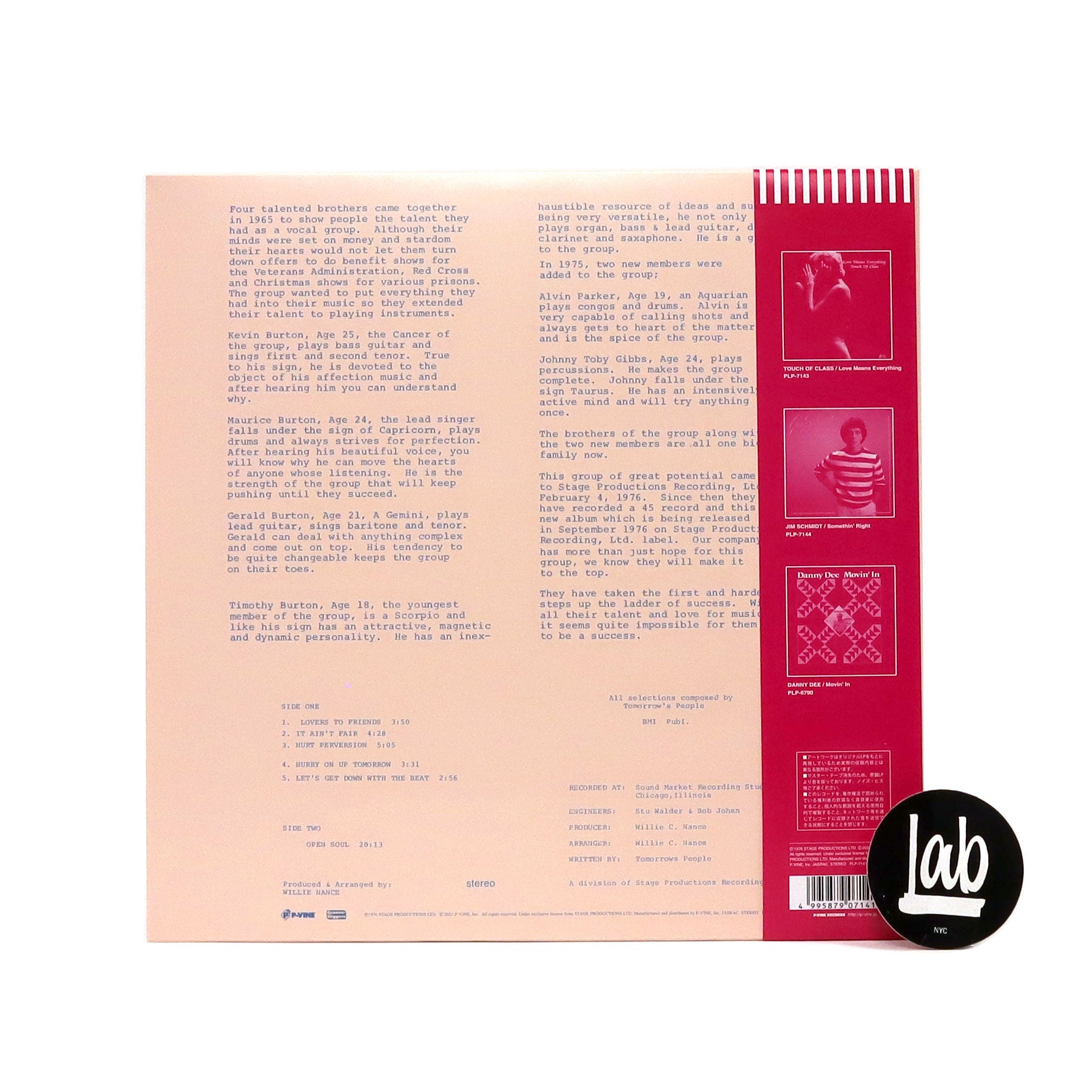 "Everybody, everybody, wanna know… What is soul?" Tomorrow's People consisted of 4 brothers (Kevin, Maurice, Gerald, and Timothy Burton) from South Chicago, and the soul-funk group released Open Soul through Stage Productions in 1976. The record has since become a holy grail for collectors, and Japanese reissue powerhouse P-Vine has brought back the 5-tracker (feel free to check prices on vinyl marketplaces for og copies) with the original cover for the first time ever. Much of the conversation concerning the LP starts around the epic 20-minute title track, which apparently was not a written piece and/or rehearsed(!!!). It begins with cosmic-soul vibes created by warm keys and guitar riffs, then around the 2-minute mark, the funk explodes with percussion, simple-yet-effective bass work, and the catchy chanting that gets at the burning question: "What is soul?" The answer lies in tunes like "Lovers To Friends," "It Ain't Fair," and "Hurry On Up Tomorrow," but also, don't sleep on the funk-disco bump of "Let's Get Down With The Beat." Recommended.