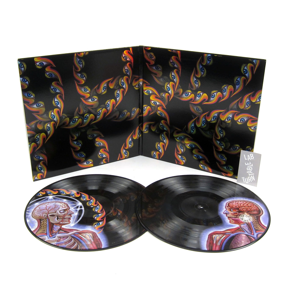 "Fifty-one months after Lateralus's original release in CD format, Tool is ready to release a double vinyl four-picture disc edition of Lateralus. Each side contains a different picture and is packaged in a plastic gatefold with a holographic foil. The materials used to create picture discs and color vinyl are not the same as traditional vinyl. Picture discs will have an inherent surface noise in playback. Picture discs will generally not have the same sound quality as black vinyl. Also LPs require cleaning prior to each play due to the mid 20th century mechanical technology that LPs are." - Sony