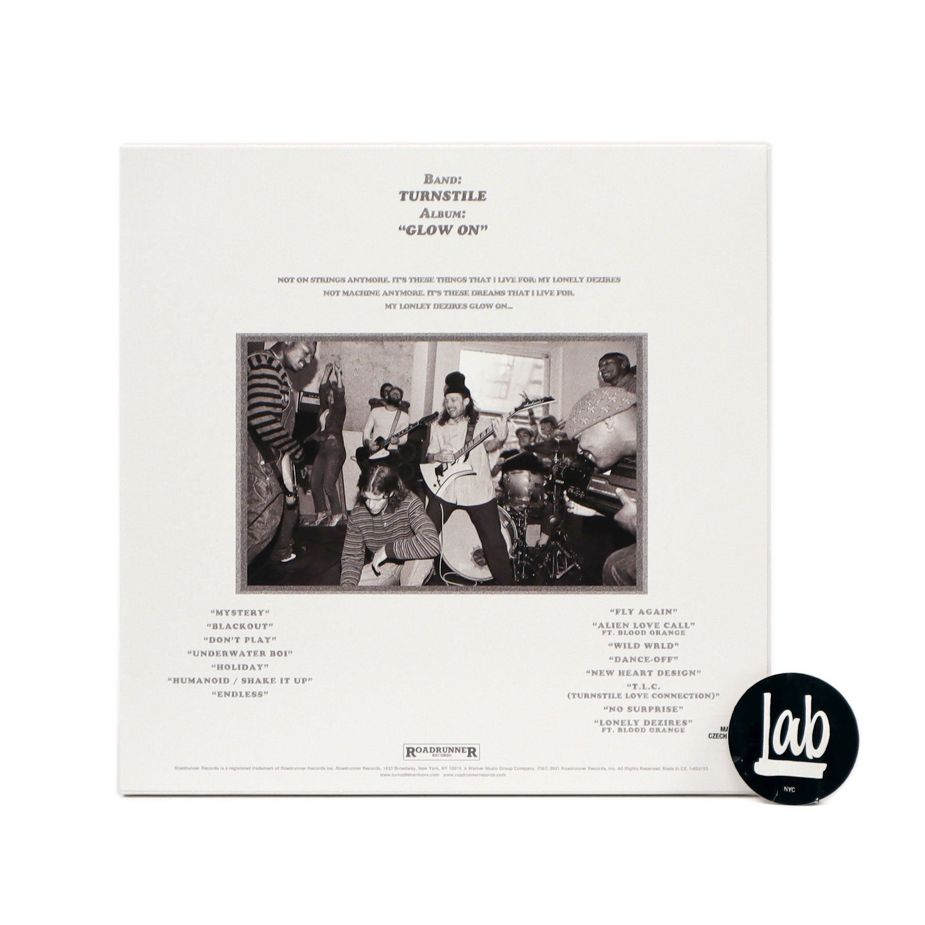 "Recorded with producer Mike Elizondo and co-produced by Yates, GLOW ON follows TURNSTILE’s 2018 album TIME & SPACE, which saw the Baltimore band charting new ground for hardcore, expanding stylistic boundaries and celebrating new possibilities. With GLOW ON that utopic vision is fully realized; 15 tracks devoid of borders, boundaries, or entry obstacles, only abundant imagination, heart, and grooves plucked from all corners of the musical spectrum. GLOW ON includes the singles 'HOLIDAY,' 'MYSTERY,' 'NO SURPRISE,' and 'T.L.C. (TURNSTILE LOVE CONNECTION) from TURNSTILE’s recent TURNSTILE LOVE CONNECTION EP and companion short film. GLOW ON also includes guest features from Blood Orange on 'ALIEN LOVE CALL,' 'LONELY DEZIRES,' with additional vocal contributions on 'ENDLESS.'" - Roadrunner Records