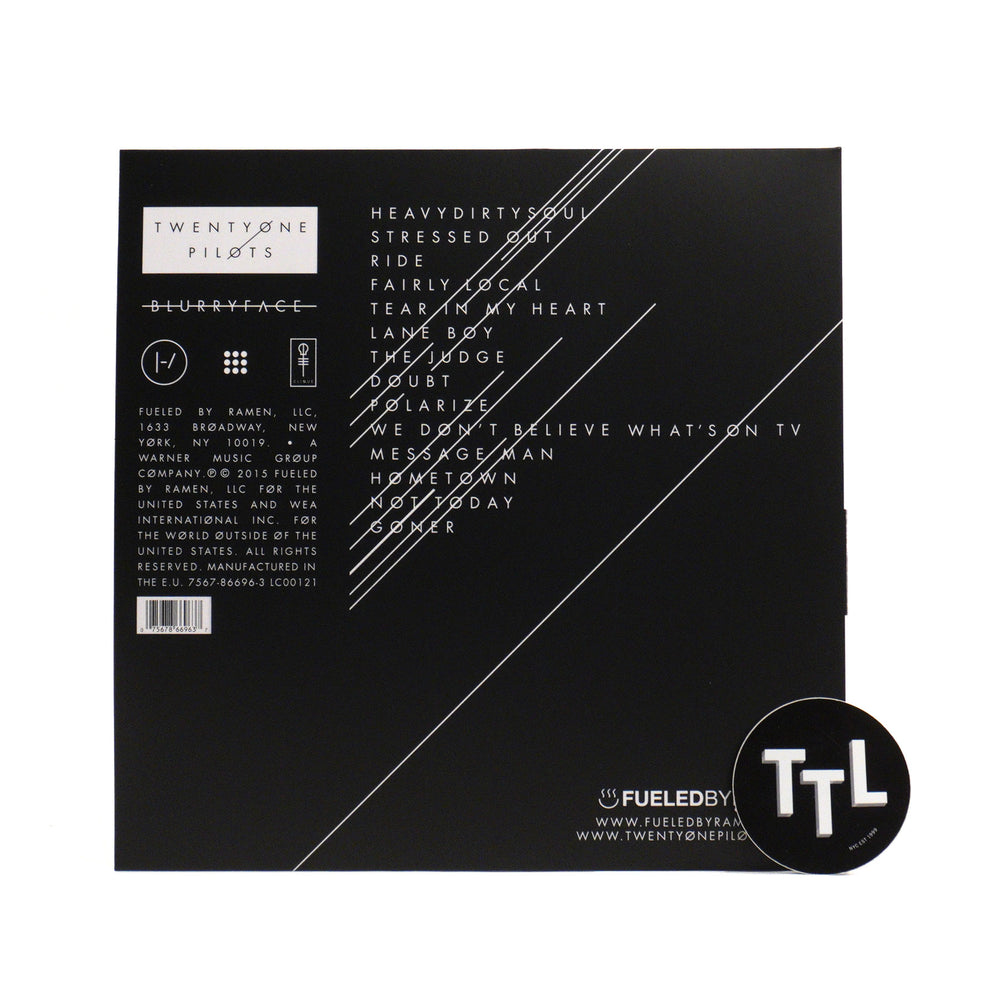 "Blurryface is the much anticipated second studio album from Twenty One Pilots. On the follow up to their highly successful debut Vessel, the band worked with famed producers Mike Elizondo, Mike Crossey, Tim Anderson and Ricky Reed to craft a genre-bending collection of dynamic and diverse songs." - Fueled By Ramen