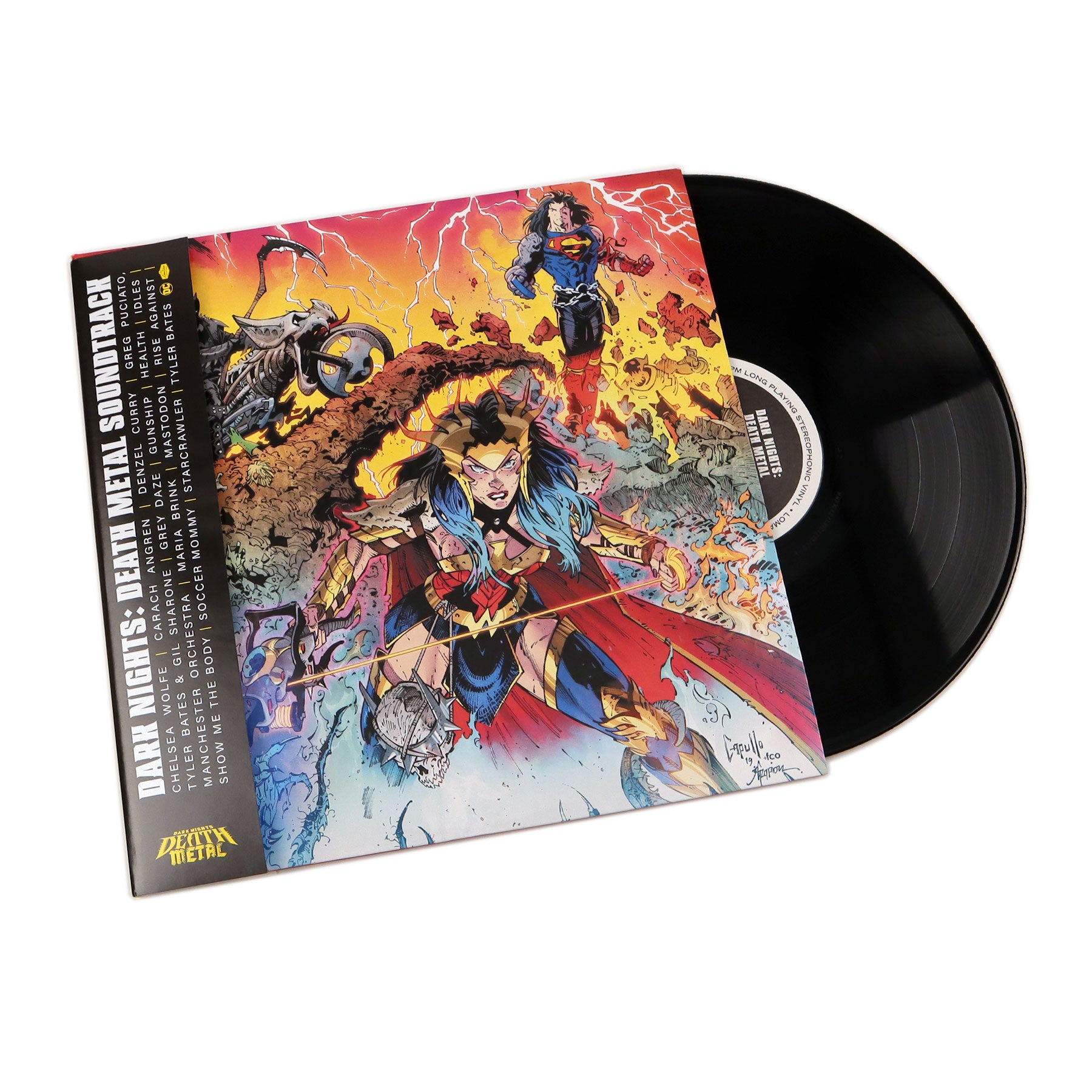 "Much like the Dark Nights: Death Metal comic series isn’t the typical superhero storyline, its musical counterpart isn’t the typical superhero soundtrack. Under the executive producer stewardship of acclaimed composer Tyler Bates (Guardians of the Galaxy, Watchmen, John Wick), Dark Nights: Death Metal is a first-of-its kind companion piece of original music, which adds further dimension to the series through a multimedia experience that includes custom limited edition comics, videos, and more. Artists such as Mastodon, Denzel Curry, Manchester Orchestra, Chelsea Wolfe, IDLES, and Soccer Mommy took a hands-on approach in its creation, contributing songs inspired by the text that depicts a hellish Earth twisted beyond recognition, wherein the Justice League is at the mercy of the Dark Multiverse and a diabolical Batman Who Laughs. Bates unites an array of artists across various genres to form his own musical super crew, creating a cohesive and towering collection that ultimately sounds like the Death Metal multiverse colliding into its sonic mirror image." - Loma Vista