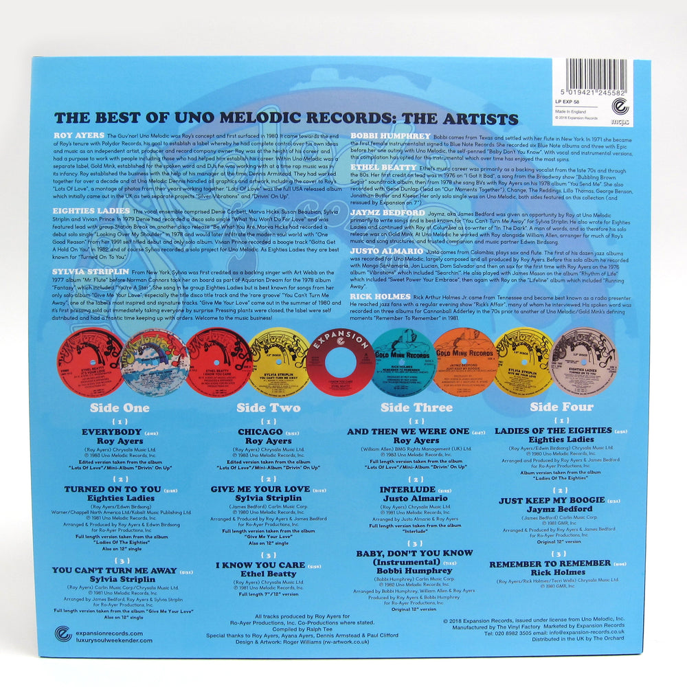"Do you want me in the way I really need you?" UK soul revivers Expansion Records collect the 12 most-sweated (for good reason) tunes from Uno Melodic and Gold Mink, boutique labels set up in 1980 to accommodate the production work of Roy Ayers. What I love most about Ayers productions are the dark and dissonant chords that always find their way into his lighthearted boogie grooves (DJ Rashad made great use of them throughout his career as well). Case in point: the smokey “Remember To Remember” featuring radio DJ Rick Holmes rattling off a list of black heroes past & present, or Ethel Beatty’s sensual boogie singalong “I Know You Care”… there’s a certain moodiness that’s just simply not present in Mizell Bros productions or the hottest Salsoul / West End twelves (which are all perfectly fine!). Well thank god I can finally part with my scratchy beater copy of Sylvia Striplin’s “Give Me Your Love” twelve, as it’s included here along with the equally crucial b-side “You Can’t Turn Me Away” (“Spin my V, smoke all my weed…”). Also: Eighties Ladies’ “Turned On To You,” Justo Almerio’s “Interlude” (if anyone’s reading this, we desperately need a reissue of the entire LP), 70s jazz-funk flute queen Bobbi Humphrey’s (moonlighting from Blue Note) sparkling rollerdisco jam “Baby Don’t You Know,” Jaymz Bedford’s “Just Keep My Boogie.” Best of all is the inclusion of rare Ayers solo joints “Everybody,” “And Then We Were One,” and the relentlessly cool “Chicago,” making this a layup for the ‘comp you didn’t know you needed of 2018’ award. 12 tracks in total, 3 per side, with extensive liner notes on the back cover. Recommended.
