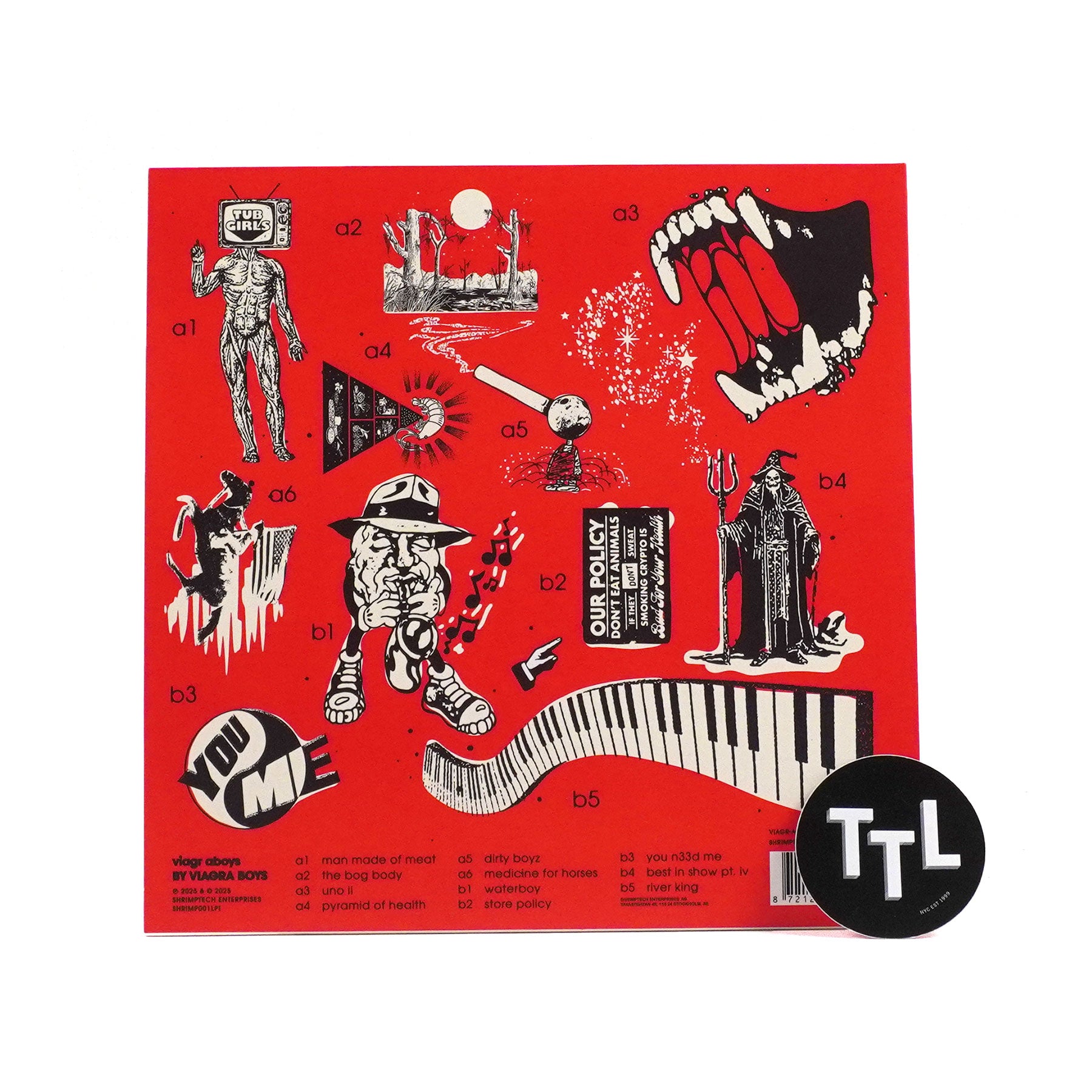 "Viagr Aboys is the fourth studio album from Viagra Boys. Featuring single 'Man Made of Meat', the LP sees VB turn inwards, leaving the acid-laced, conspiracy-addled societal commentary of previous LP Cave World behind to journey into the acid-laced, conspiracy-addled landscape within. Absurd, intense and surprisingly tender, Viagr Aboys shuts out the noise to find that the important part of being alive in the big, stupid world is figuring out that the world inside of you that is equally big and stupid." - Shrimptech Ent.