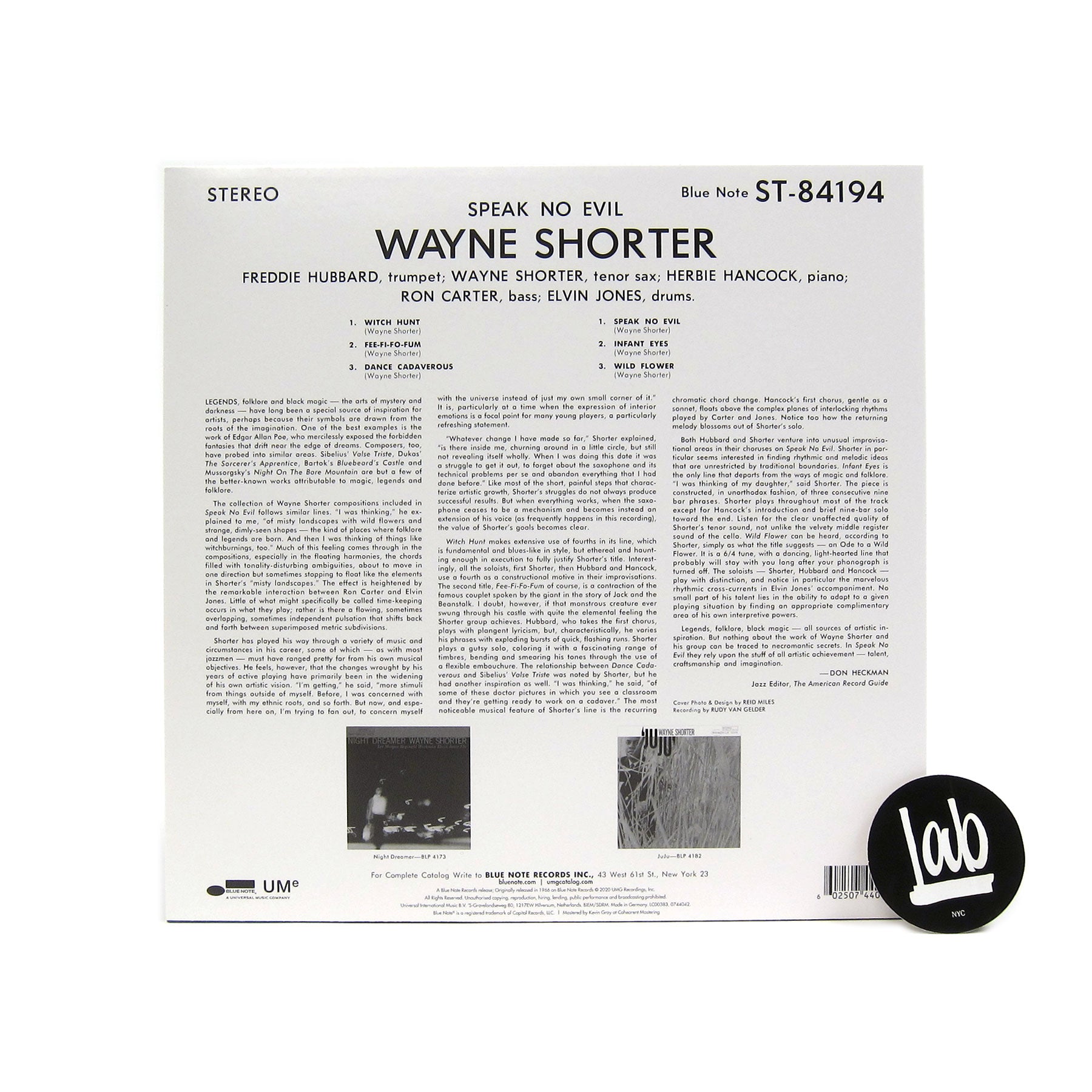 "1964 was one of the most momentous years in the musical life of Wayne Shorter. Early in the year the saxophonist was still a member of Art Blakey & The Jazz Messengers, appearing on classic Blue Note albums like Free for All and Indestructible. Shorter made his own auspicious label debut that spring with Night Dreamer and quickly recorded the impressive follow-up JuJu. That summer he joined the Miles Davis Quintet, cementing a line-up that would become one of the seminal bands in jazz history. And when Shorter entered Van Gelder Studio with Freddie Hubbard, Herbie Hancock, Ron Carter, and Elvin Jones on Christmas Eve 1964 they created a masterpiece with Speak No Evil, a transcendent set of six Shorter originals including the swinging title track, 'Witch Hunt,' and sublime ballad 'Infant Eyes.' This Blue Note Classic Vinyl Edition is all-analog, mastered by Kevin Gray from the original master tapes, and pressed on 180g vinyl at Optimal." - Blue Note Records