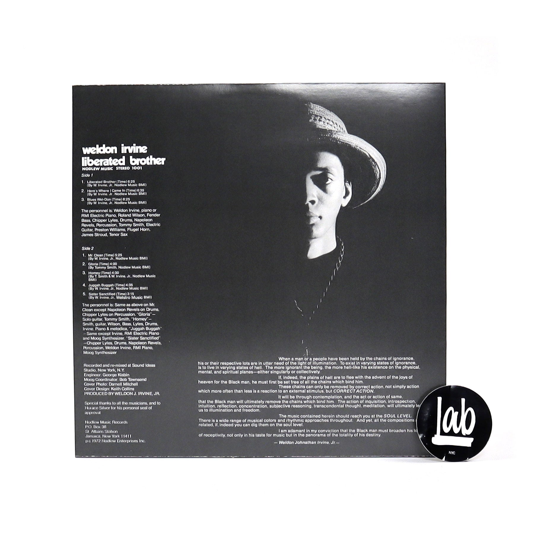 WELDON IRVINE, FOR THE UNINITIATED, WAS ONE OF THE GREAT UNSUNG talents of modern American music. A talented multi-instrumentalist and composer, he had a musical vision that was unerringly soulful, sincere and funky. Liberated Brother was his first album, originally issued on his own Nodlew label ('Weldon' spelled backwards) in 1972 in extremely limited quantities. A showcase for his writing skills, the extremely rare record includes such future standards as "Mr. Clean," famously claimed by Freddie Hubbard, and "Sister Sanctified," reworked by Stanley Turrentine and notorious as the basis for BDP's "My Philosophy." So you get the idea, the guy had serious jazz chops, but as a longtime resident of Queens got down with the Jamaica funk as well (in fact he tutored Tom Browne, Bernard Wright, Don Blackman, Q-Tip and other funky folks from the Q-boro). Further proof? Dig "Homey," a laid back groove that sounds like Augustus Pablo jamming with Clyde Stubblefield in a bordello. Don't sleep on the title track either, a guiro-led latin strut that Horace Silver murdered on his 27th Man LP for Blue Note. Faithful reproduction of the original cover, recommended.