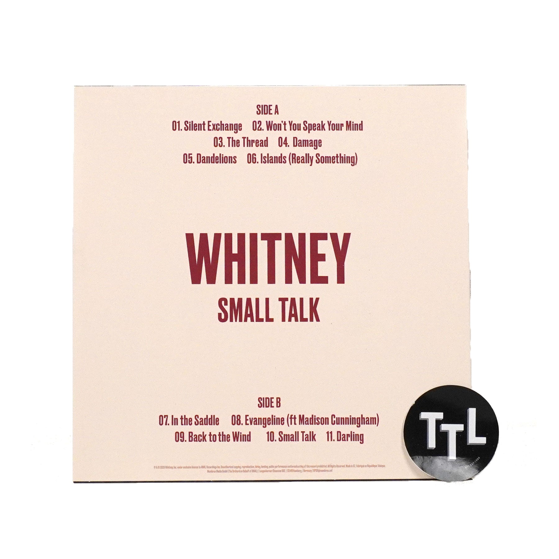 • "Small Talk is Chicago duo Whitney's fourth and unequivocally best and most affecting album. After a decade of being roommates and bandmates, first in Smith Westerns and then in Whitney, Julien Ehrlich and Max Kakacek entered the studio in the Summer of 2024, sans-producer, with assorted pals dropping into add parts. The result is 11 incandescent songs that delight on two levels. There are instant classic Whitney songs here, tunes that tug at the same heartfelt melodic strings they've always pulled, and still other moments that speak to how much room they gave themselves to evolve." - Whitney