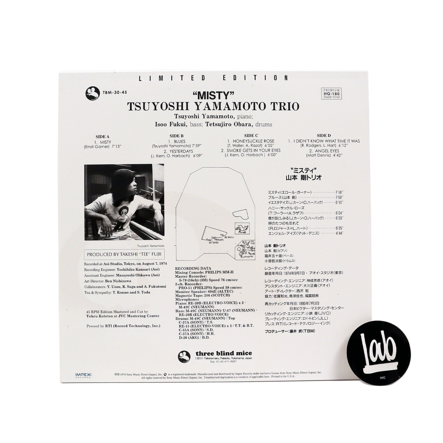 "Mastered by Tohru Kotetsu and pressed at RTI, this 45rpm LP will live up to and surpass your most demanding judgments. Misty is one of the most sought-after titles from the acclaimed Three Blind Mice catalog. Touring with the Micky Curtis Band, Tsuyoshi Yamamoto had the chance to explore several international experiences that he would later use on his 1974 album, Misty, as he worked with this band in France, England, and Switzerland. The Yamamoto Trio’s Misty is a Stoned Cold Killer! A1 Reference Material!!! Misty earned both the 'Best Engineering' Award and Jazz Disc Award of Swing Journal in 1974. Recorded at Aoi Studio, Tokyo, on August 7, 1974. Tsuyoshi Yamamoto is highly musical and his expressions natural, neither overly technical nor serious, his performance is relaxed and melodious." - Impex Records